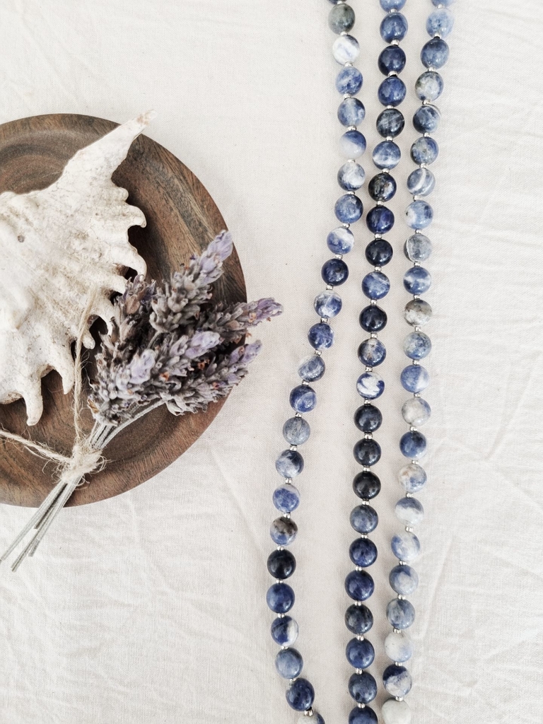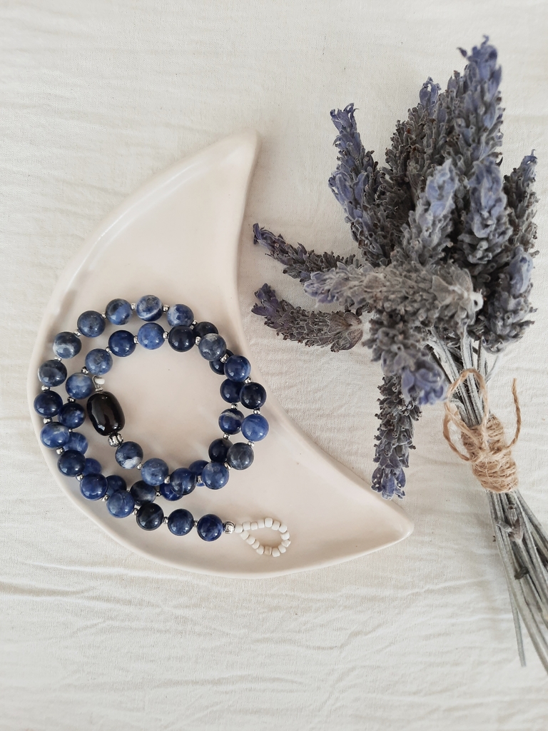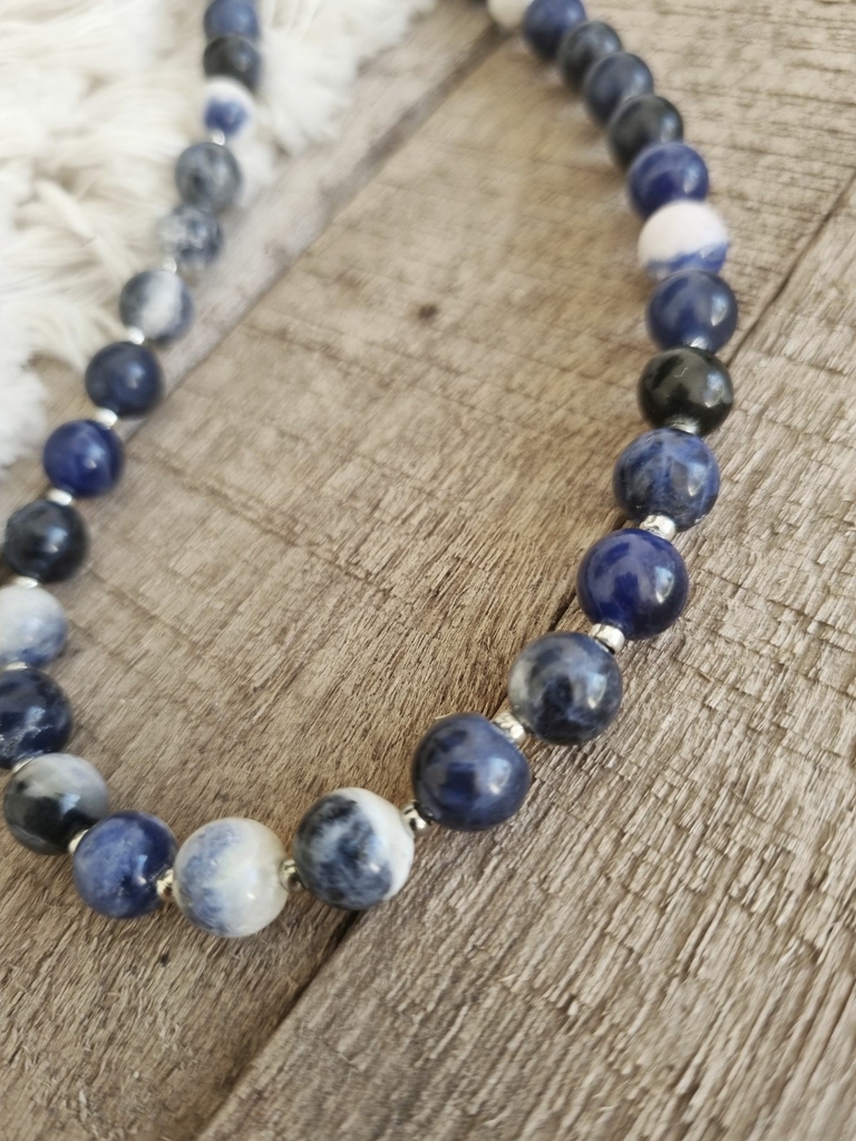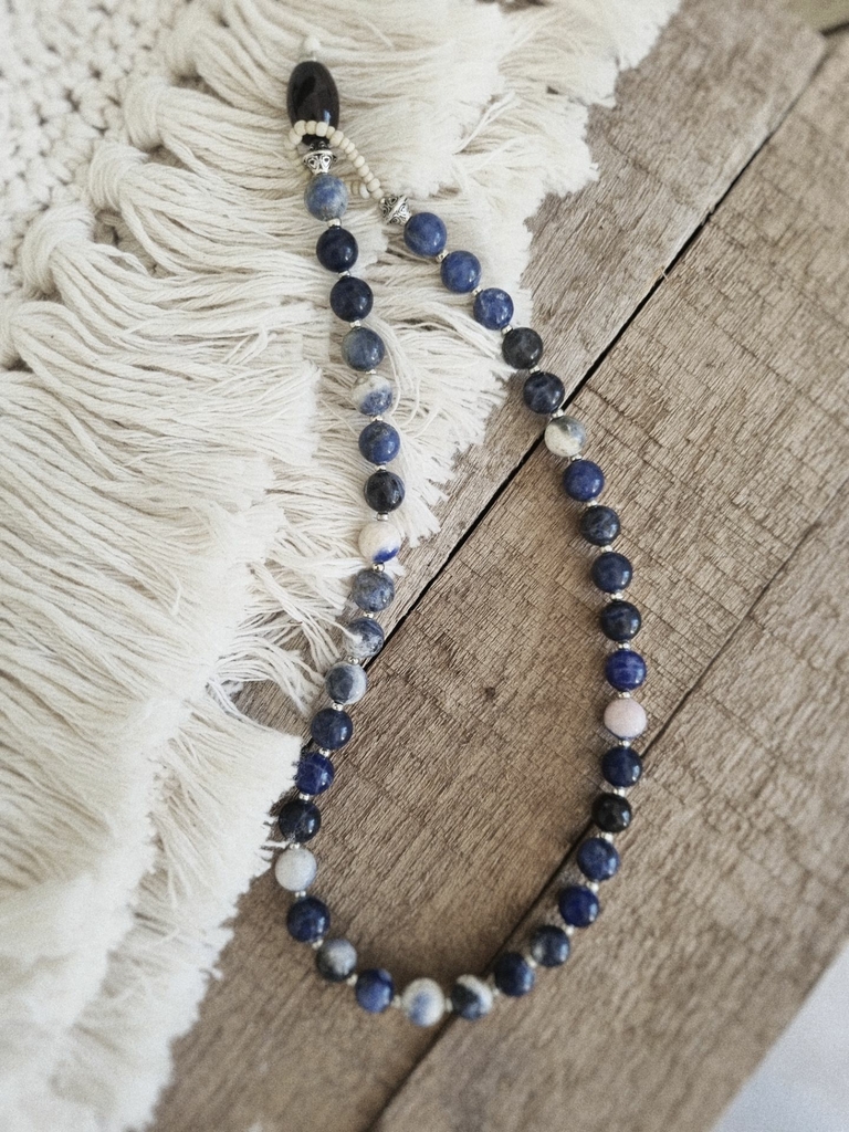 S O D A L I T A . B L E S S es un choker único elaborado con piedra natural de sodalita, reconocida por su belleza y propiedades energéticas. Su largo de 40 cm ofrece un ajuste cómodo y elegante, ideal para realzar cualquier look con un toque de sofisticación y autenticidad.